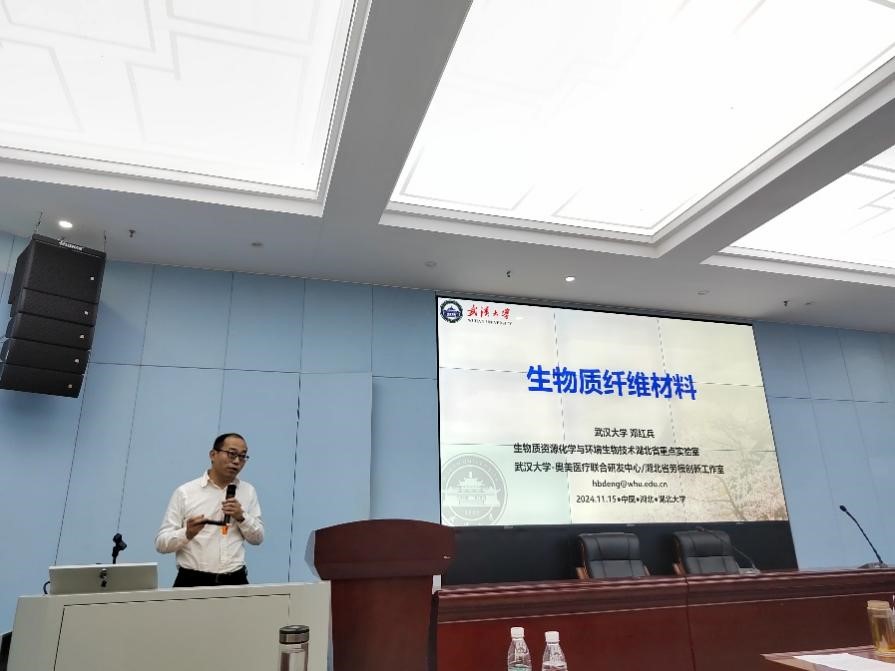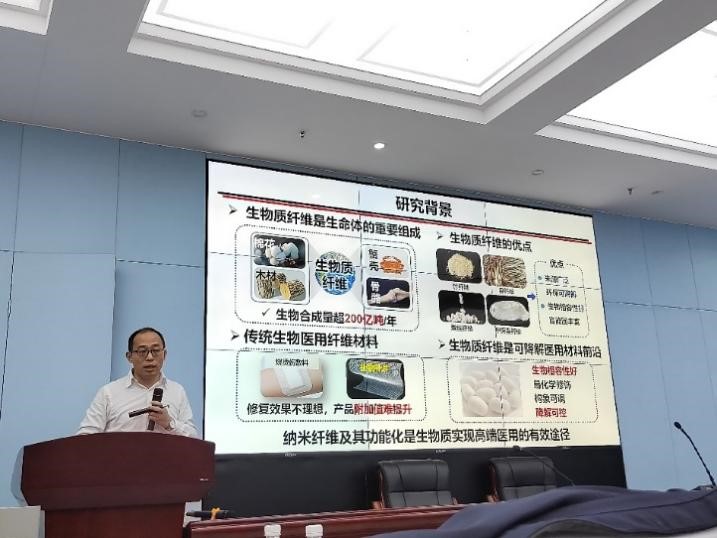 邓红兵教授以“生物质纤维材料及其在大健康领域的应用”为题,详细介绍了他的团队在将生物质纤维应用在医疗领域方面所开展的研究工作所取得的进展。近年来,邓教授团队成功将生物相容性好、天然可降解的生物质纤维应用在了包括慢性伤口护理长效抑菌和创面修复、多重生长因子梯度负载与智能释放、急性心梗后心肌缺损干预、骨不连和骨缺损修复、软骨重构与再生、血液过滤等领域。在取得丰硕的学术成果的同时,还积极推动其产品的临床应用,取得了国内首个丝素蛋白植入类三类医疗器械注册证,并为同类产品实现国产替代做出重要贡献。邓红兵教授报告引起参会师生的浓厚兴趣,与会师生踊跃提问,邓教授对师生的提问均逐一进行了详尽地解答,报告取得良好的效果。