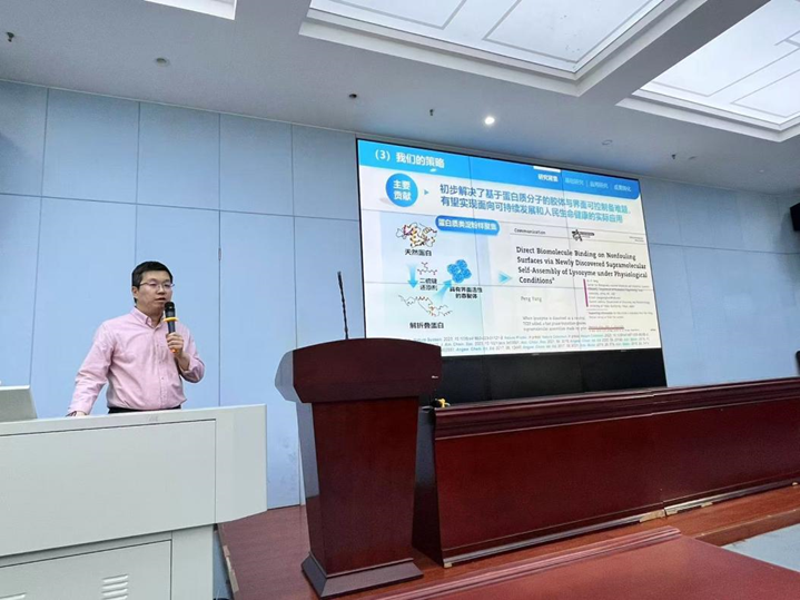 报告以“类淀粉样蛋白质组装及表界面改性”为题,杨鹏教授围绕如何实现高效控制类淀粉样蛋白在表界面处有序组织这一科学问题,阐述了类淀粉样蛋白质可控聚集的机理、蛋白质纳米膜结构与性能调控方式。提出了超快速类淀粉样蛋白质聚集的新策略,可实现低成本、快速和批量制备蛋白质超分子材料,初步建立以蛋白质为主要原料的可持续发展材料和技术体系,低成本、快速和批量制备相转变蛋白质聚集体材料,这种材料具有优异的无色透明性、界面粘附稳定性和生物相容性。杨教授也介绍了蛋白质可控聚集体系在生物医用涂层、水处理吸附材料、新型生物农药等方面的特色应用。本次报告为师生提供了该领域前沿的学术见解,拓展了研究生们的科研视野。