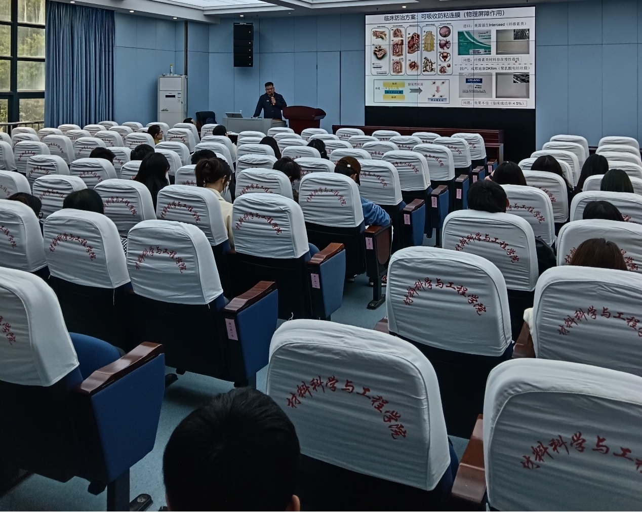王毅教授的报告题目为“医用纳米纤维表面润滑防粘连技术的开发”。报告中,王毅教授从研究背景与意义即术后粘连防治是国家重大医学临床需求出发,讲授了组织粘连形成的摩擦学过程;结合自己在生物摩擦学与表面工程,包括生物润滑材料的研发与应用、医疗器械的表面功能化改性、抗菌材料表界面设计的丰富研究经验,重点讲授了纳米纤维膜的表面水合超润滑改性的策略及其在临床医学产业化过程中遇到的实际困难和潜在的解决方案。王教授结合具体实例讲解物理方法构建超滑界面、化学方法构建超滑界面体系,深入浅出、生动幽默地讲授接枝后纤维膜具有显著水合润滑的摩擦学特征及其物理化学机理,使学院师生受益匪浅。报告尾声王教授分享了“我的学术奋斗之路,经验分享”,讲述自己直面失败与挫折、在逆境中保持自信、天助自助者的成长经历。交流环节,学院师生对王教授的工作十分感兴趣,大家积极提问,王教授耐心详细解答。