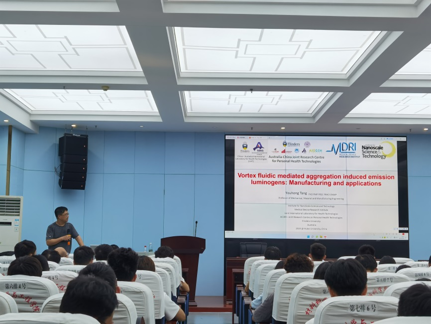应材料科学与工程学院邀请,弗林德斯大学(Flinders University)唐友宏教授莅临学院访问讲学。9月19日上午,唐友宏教授在材料学院二楼学术报告厅为材院师生作了一场主题为“Vortex fluidic mediated aggregation induced emission luminogens: manufacturing and applications”的学术报告,报告由郭院长主持。