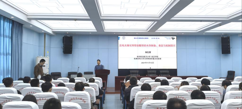 南京航空航天大学朱孔军教授予2021年11月12日上午受邀来我院访问讲学,并在材料学院二楼学术报告厅为材院师生作了一场主题为“压电光催化特性钛酸钡的水热制备、表征与机制探讨”的精彩报告。报告会由副院长施德安教授主持。