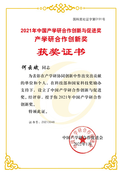 近日,中国产学研合作促进会公布了“2021年中国产学研合作创新与促进奖”评选结果,我校材料科学与工程学院何云斌教授荣获产学研合作创新奖(个人)。