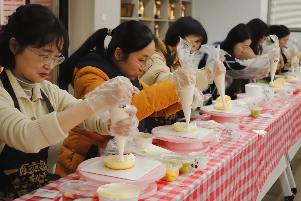 3月7日上午,在材料学院党群活动室,一群平日里在实验室、讲台严谨认真的女性教职工们,化身为了快乐的甜点师。她们脸上洋溢着幸福与喜悦的笑容。桌面上摆满了各式各样的蛋糕胚、奶油、水果和装饰物。女同胞们小心翼翼地拿起奶油裱花袋,将雪白的奶油均匀地挤在蛋糕胚上,手法虽然略显生疏,但那份专注与认真却让人动容。