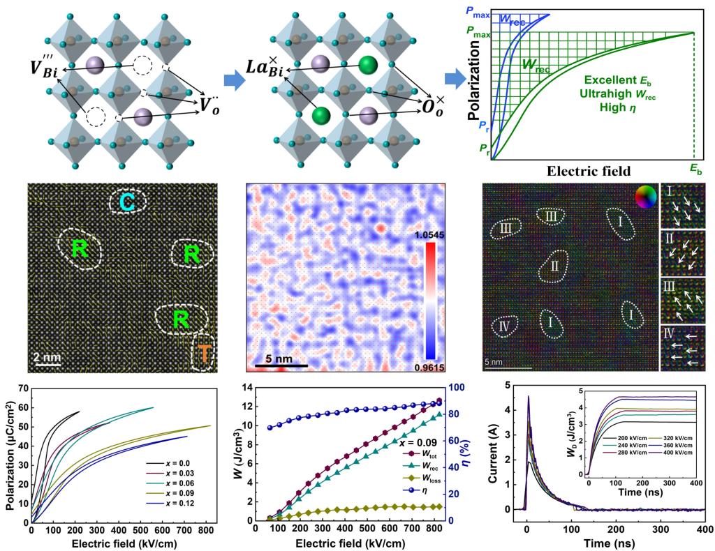 该工作设计并利用流延工艺制备了一系列Bi0.5Na0.5TiO3基弛豫铁电陶瓷,并通过引入La3+离子对氧空位、极化、击穿强度、相结构和电畴结构进行多尺度调控。运用球差校正透射电镜分析了La3+离子在原子尺度上对陶瓷的极化、相变和极性纳米微区的影响。研究结果表明,当La3+取代9%的Bi3+后,菱方和四方相结构部分转变为立方相,同时弱耦合的菱方‒四方‒立方多相极性纳米微区进一步减小到2–3 nm,从而产生超快速的极化响应和低极化滞后。最终,在820 kV/cm的电场下,陶瓷具有可回收能量密度为11.2 J/cm3、充放电效率为88%的优异储能性能(见图2)。