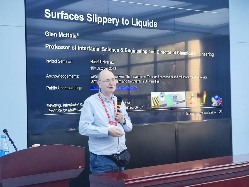 10月15日下午4点,材料科学与工程学院举办主题为“Wettability,adhesion and liquid firction”的专题报告。报告人Glen McHale教授是界面科学与工程领域的国际知名专家,也是爱丁堡大学化学工程系主任、多尺度热流体研究所成员。报告会吸引了材料科学与工程学院师生的积极参与。