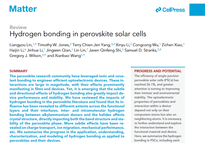 近日,湖北大学材料科学与工程学院王贤保教授团队在Cell Press旗舰刊《Matter》在线发表题为“Hydrogen Bonding in Perovskite Solar Cells”的综述文章。林俍佑副教授为第一作者,王贤保教授和澳大利亚CSIRO Gregory Wilson教授为共同通讯作者,湖北大学为第一通讯单位。