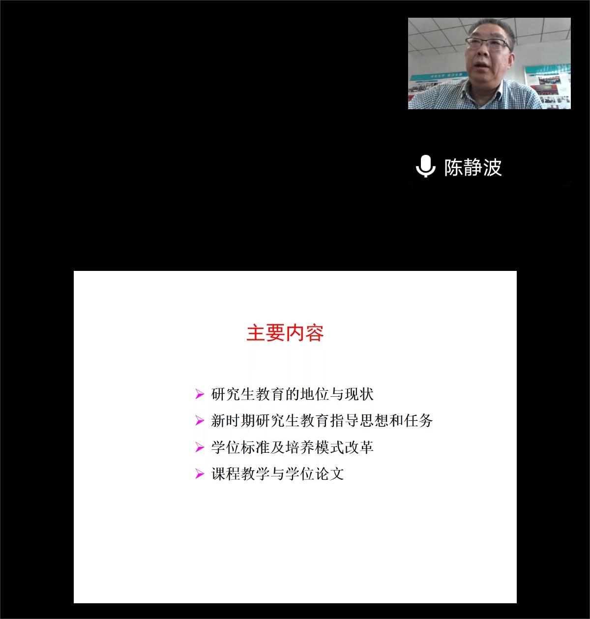 陈静波教授在线作了题为《立德树人提高质量追求卓越——关于研究生教育的几点认识》的报告,他在报告中详细介绍了研究生教育的地位与现状,阐释了新时期研究生教育指导思想和任务,解读了学位标准及培养模式改革,以聚合物加工流变学课程为例指明课程教学设置的方向。他指出研究生教育肩负着“高端人才供给”和“科学技术创新”的双重使命,立德树人、提高质量、追求卓越是研究生教育的永恒主题。