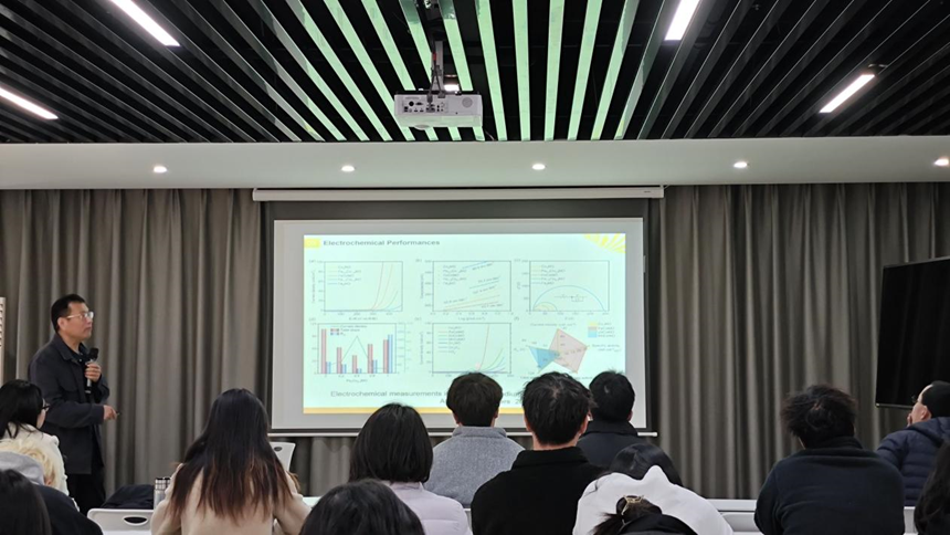 在学术报告中,程教授首先系统介绍了多铁性材料的研究背景和发展现状。程教授重点介绍了团队在多铁性材料研究中的系列创新突破:通过提出新型磁电耦合机制,在二维材料异质结构中实现了强磁电耦合效应,并将该效应成功拓展至斯格明子的调控研究,为新型存储器件开发奠定理论基础;同时基于局域结构无序化策略显著提升了弛豫铁电材料的压电性能;特别是在电催化领域,团队首次揭示了自旋态在水分解中的关键作用,为高效催化剂设计提供了全新思路。