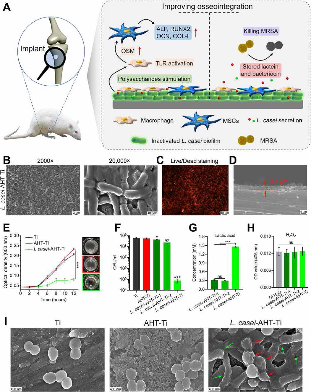 该团队利用食品级灭活的干酪乳酸杆菌生物膜在钛植入体表面构建了功能性涂层,生物膜中的乳酸和细菌素在体内和体外对耐甲氧西林的金黄色葡萄球菌(MRSA)表现了优异的抗菌性能。同时通过对相关蛋白和基因分析,证实了干酪乳酸杆菌生物膜可以有效激活巨噬细胞的免疫响应,分泌的成骨细胞因子成功促进了骨髓间充质干细胞的成骨分化并加速了骨整合。这种益生菌修饰的骨植入体,由于不会将活菌引入血液,将是一种安全的生物功能材料。这项研究表明益生菌不仅可以治疗肠道疾病,而且在其他疾病的免疫治疗中也有着潜在的应用。