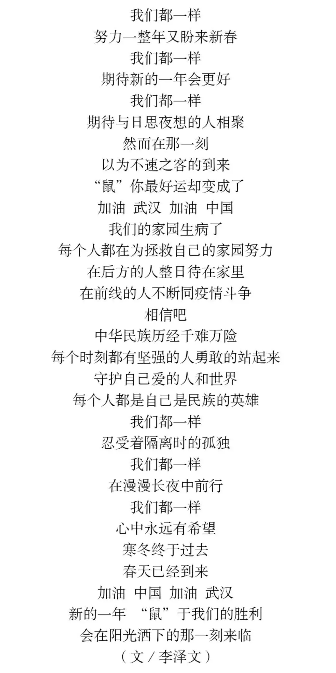 2020年这个数字本来是很美好的。可是疫情的到来给我们祖国蒙上了一层乌云。但是在这人人自危的时刻,也涌现出了许许多多的英雄,他们担起抗击疫情的责任,勇敢逆行。而作为大学生的我们,虽然无法奔赴前线抗击肺炎,但是我们可以在日常点滴中默默支持一线的英雄们。“只要还有一粒米,不去人多地方挤,只要还有一滴油,呆在家里不露头”这是对自己负责任,对他人负责,更是对社会、国家最大的支持!----王实锋