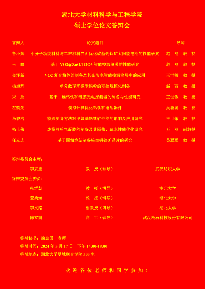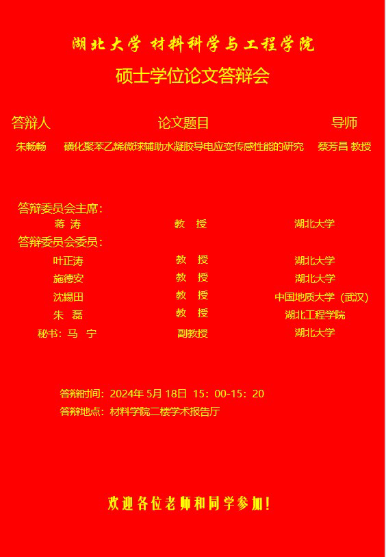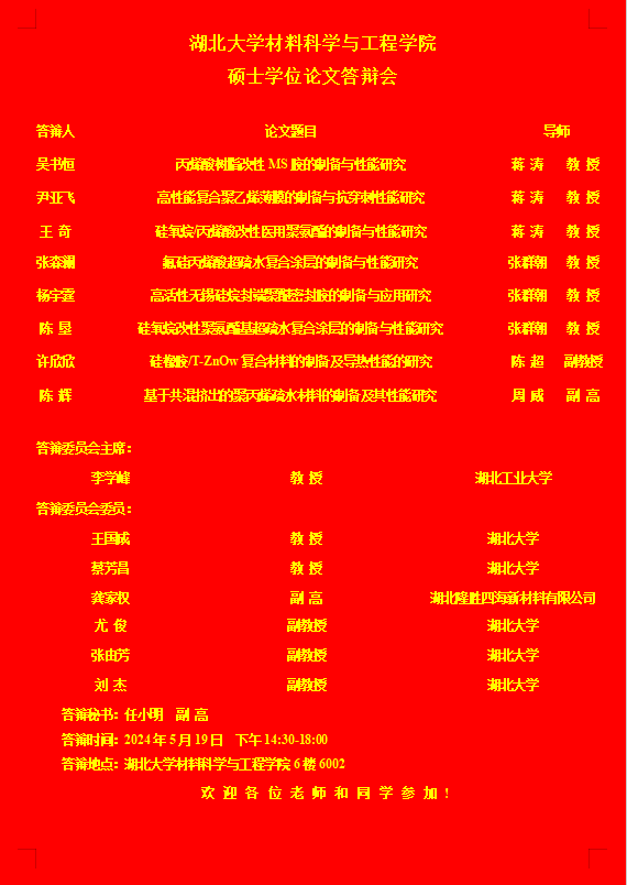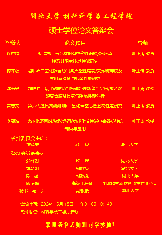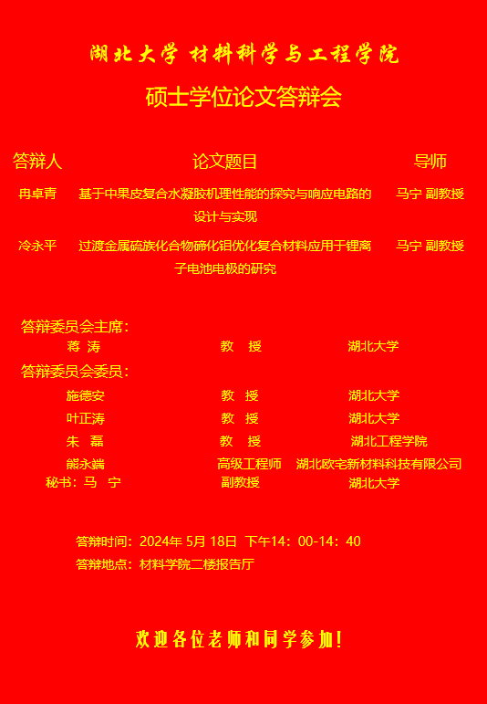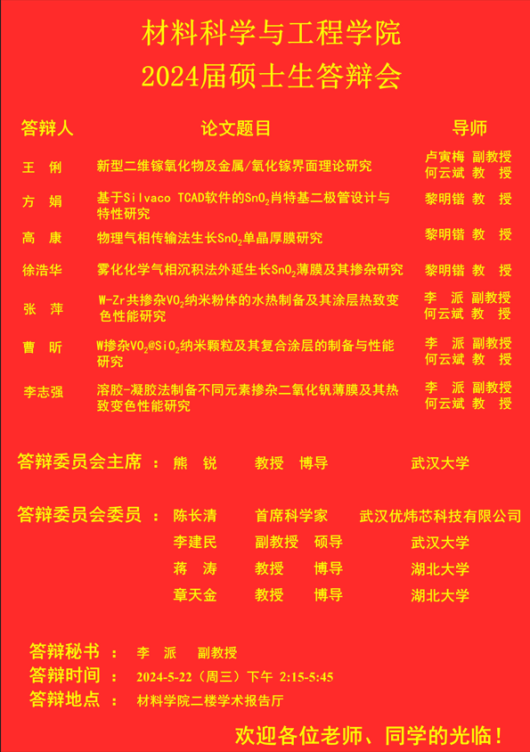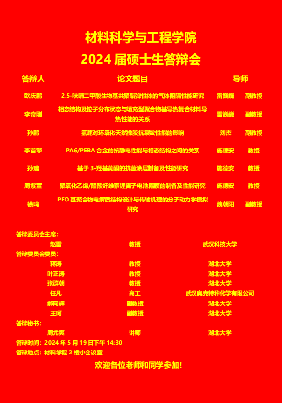 材料科学与工程学院2024年上半年答辩公告
