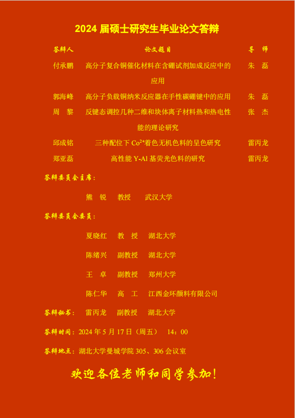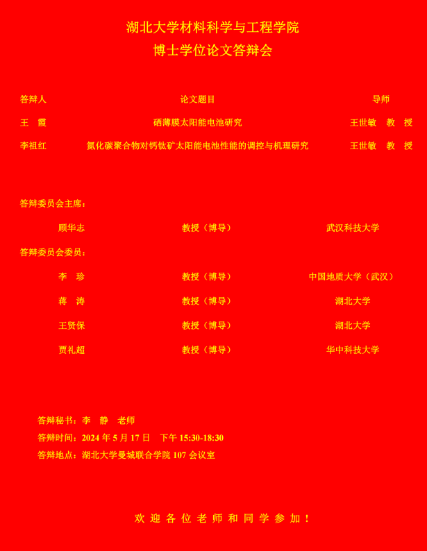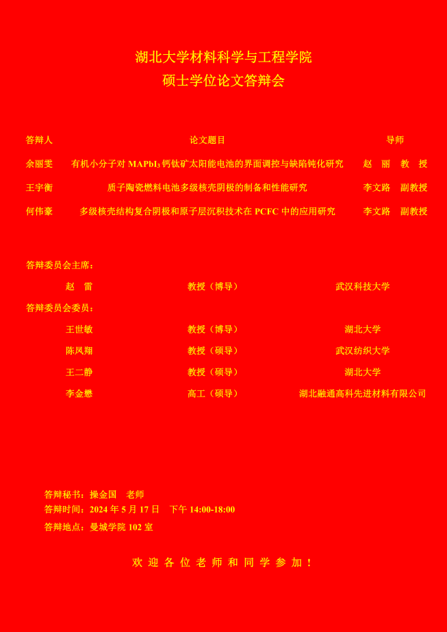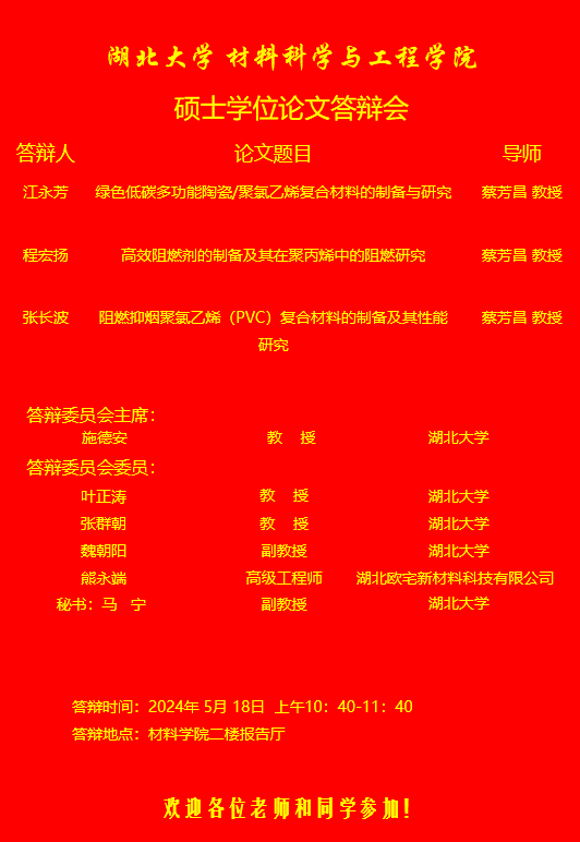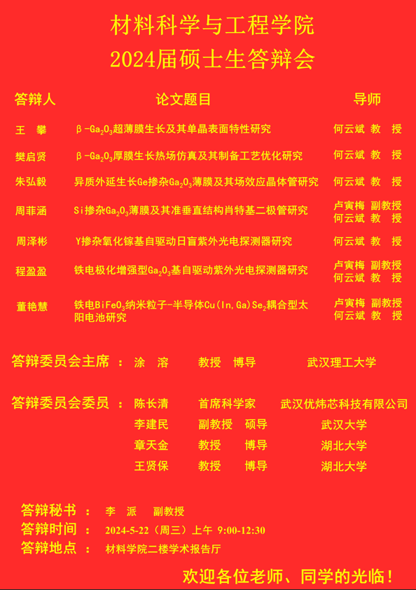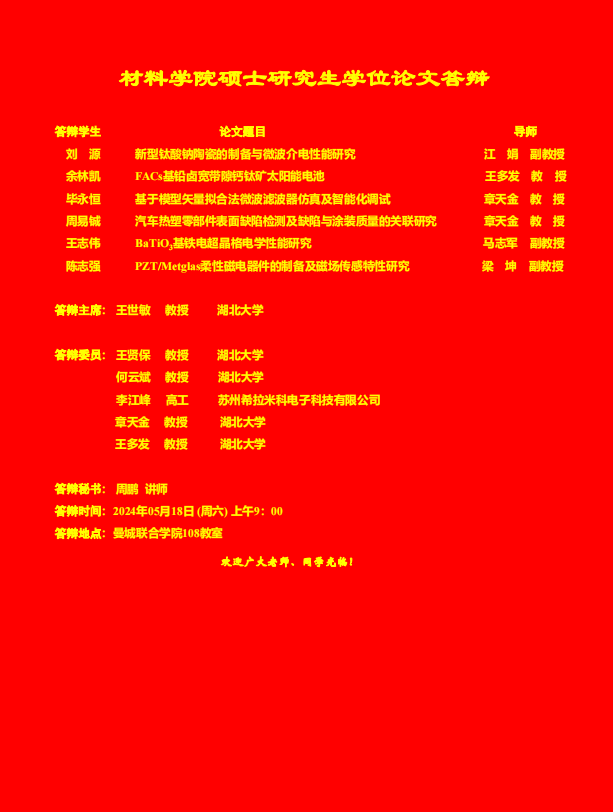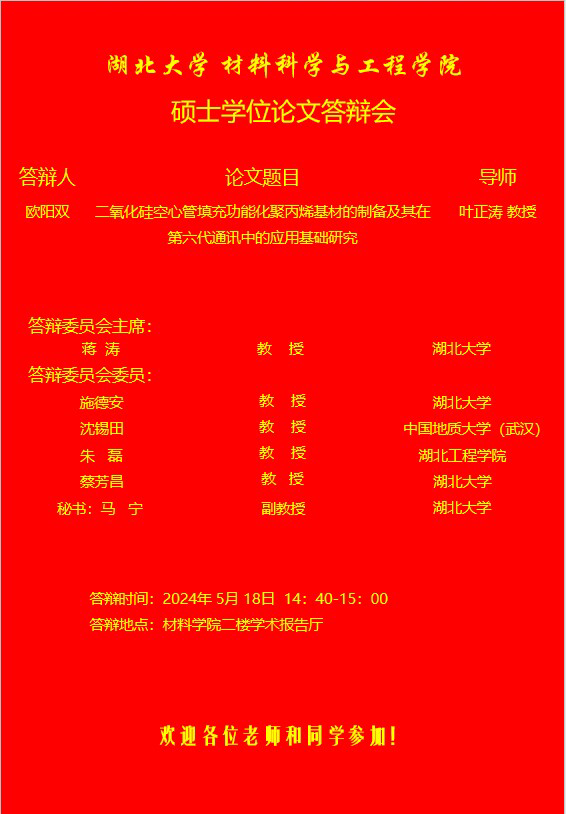 材料科学与工程学院2024年上半年答辩公告