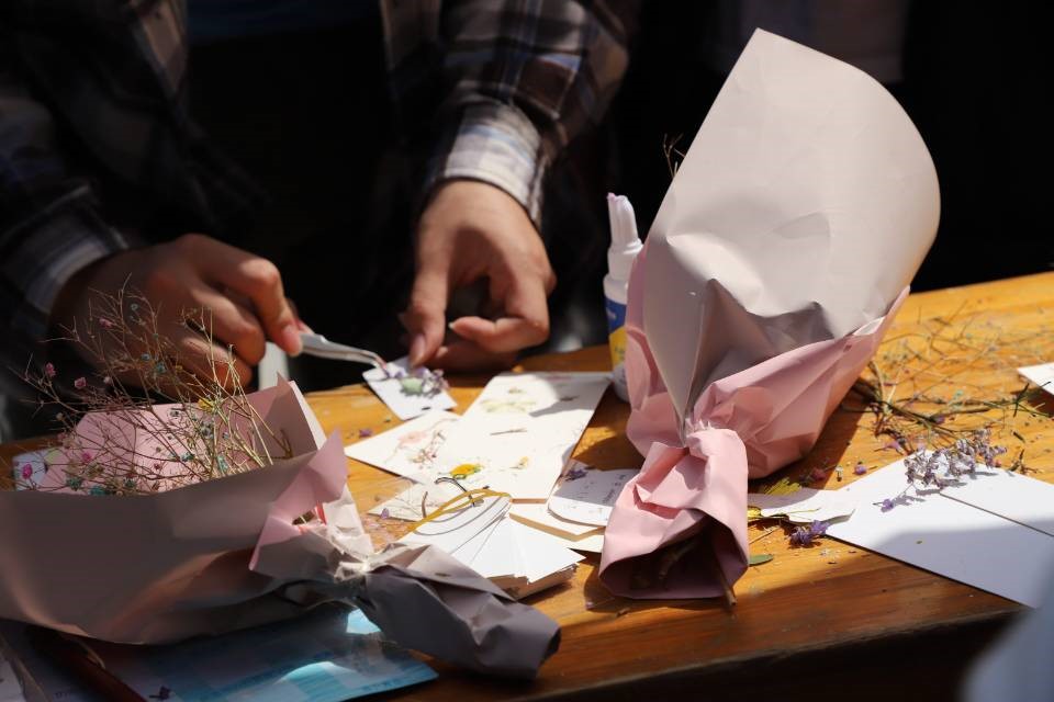 太阳渐渐变得火辣,同学们被摊位前色彩斑斓的干花和五彩缤纷的颜料吸引了眼球。他们纷纷驻足,听完志愿者的讲解后跃跃欲试,都想要发挥自己的创造力制作出独一无二的作品。现场气氛十分火热,志愿者们也十分热情,以实际行动践行着“无私奉献、助人为乐、不畏艰苦”的雷锋精神。
