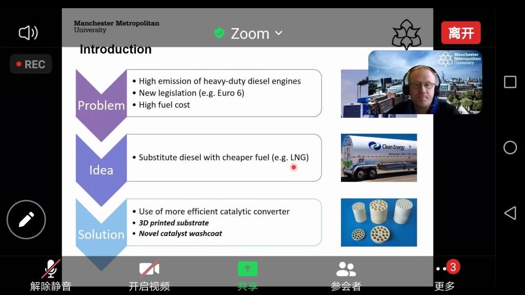 Aidan Doyle博士给同学们介绍了目前柴油发动机存在的燃烧不充分带来的环境和成本问题,提出用更便宜的燃料来替代柴油的想法,并展示了通过3D打印技术来设计和制备高效的催化转化材料的处理方案,将材料学中的科学问题和工艺问题结合起来,讲述了催化材料从设计到最后打印出来进行应用的全过程。