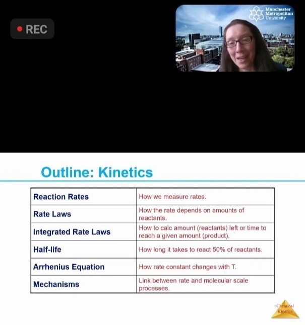 Lindsey Munro教授主要讲授了物理化学中动力学部分,包括反应速率,速率定律,半衰期,反应机理等相关内容。她在课上除了讲授物理化学的基本原理外,还设置了不同的互动问题,同学们积极回答,课堂氛围活跃。另外,她还展示了物理化学的在线学习资源,包括网上模拟实验小游戏,仿真实验室等内容,引起了同学们的广泛兴趣。