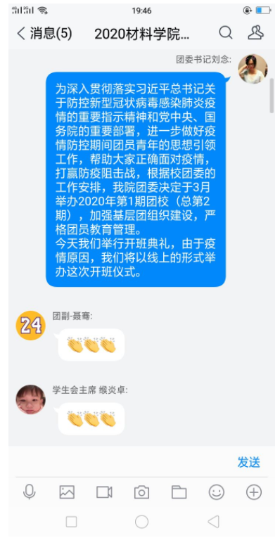 在活动的最后,刘书记宣布本次开班仪式结束。团委副书记聂骞发放“疫情当下,国家先进人物的优良事迹”视频,供大家学习。同学们纷纷表示会按时完成学习,并及时将学习结果反馈给负责人。