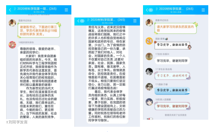 学员代表刘承东代表全体学员发言。在发言中他说到,作为新时代的大学生,我们应该注重自身思想道德,政治素养的培养,尤其是在战“疫”的特殊时期。同学们对刘同学的话十分认同,决定一起努力,做好团员应该做的事。