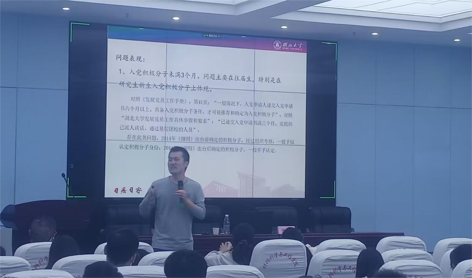 11月18日,湖北大学马克思主义学院组织员邹浩作了题为《遵循入党程序,严格要求自己——以实际行动向党组织靠拢》的辅导报告,强调入党积极分子应保证入党动机的纯洁性,提醒学员们“既对自身负责,也要对党组织负责”,强调要遵守组织纪律,对自我严格要求。