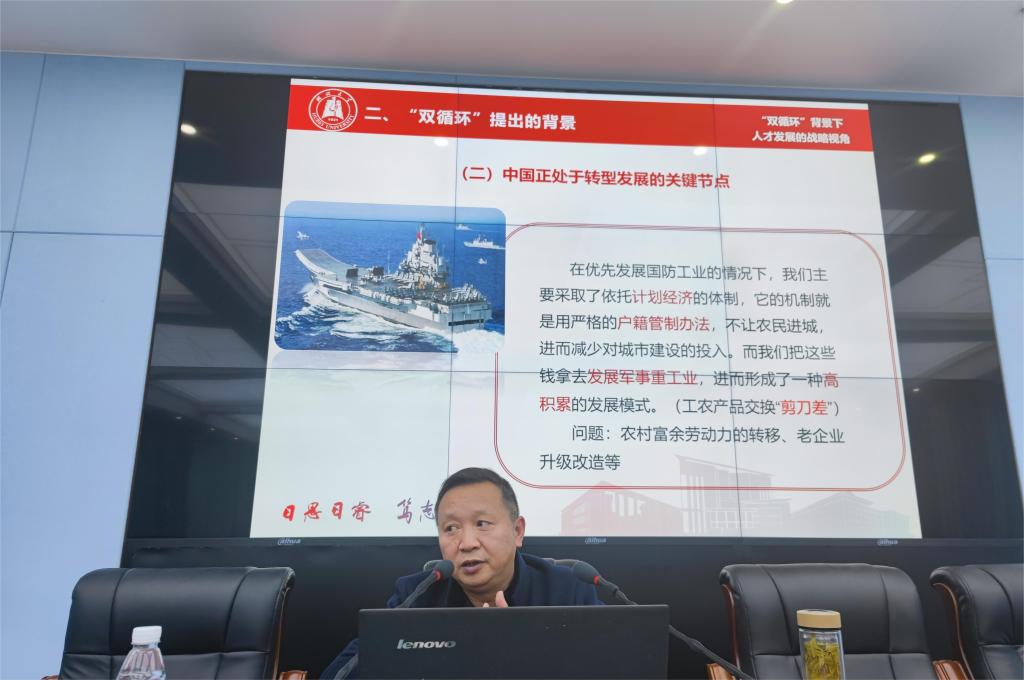11月17日,湖北大学党委宣传部常务副部长何顺进作了题为《双循环背景下人才发展的战略视角》的辅导报告,从习近平总书记论新发展格局、双循环提出的背景、目前我国内外循环存在的问题以及双循环背景下人才发展的战略视角四个方面,向学员们介绍了双循环的重要内容。