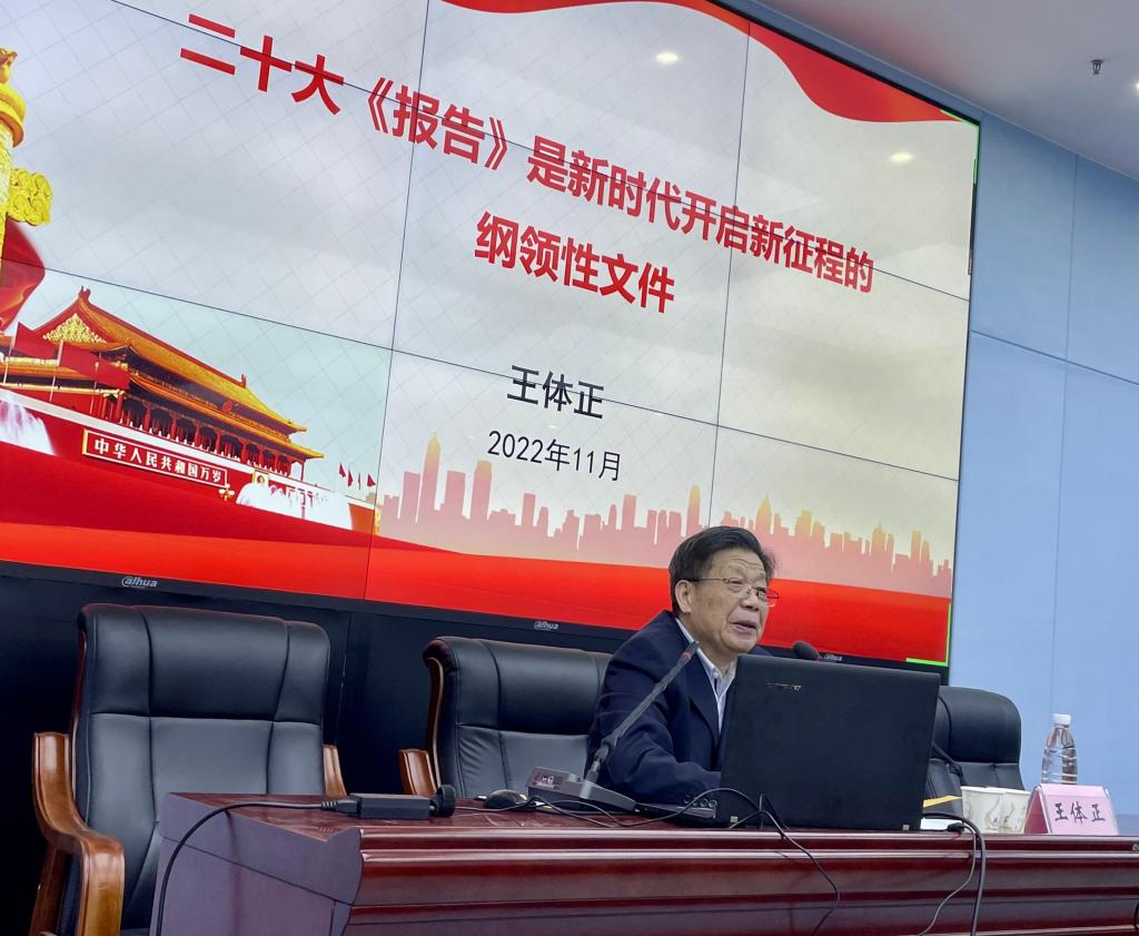 11月11日晚,学院第24期党的基本理论知识培训班正式开班,湖北大学党委宣传部原部长、组织员王体正,院党委书记宋韧,组织员吴新国,院党委副书记鲁力格格出席开班仪式。开班仪式结束后,王体正教授作了题为《二十大报告是新时代开启新征程纲领性文件》的首场辅导报告,结合中共一大到二十大的发展历程,向学员们重点介绍了党的二十大报告的具体内容。
